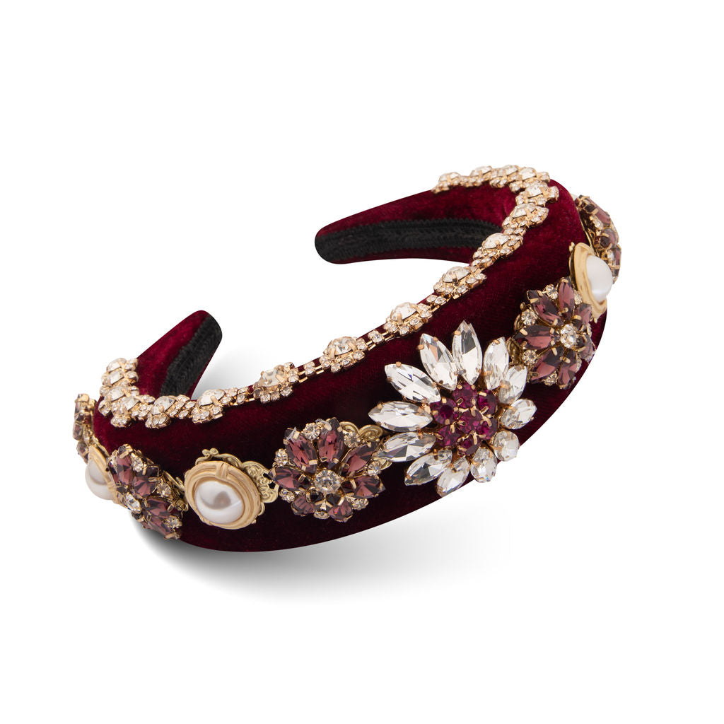 This limited edition headband is a crown sure to hold the admiration of onlookers. Padded in plush maroon velvet with bold pearl, gold, and crystal accents this piece is not for the faint of heart. Surely after one wear this headband will be solidify as a fashion staple in your closet.